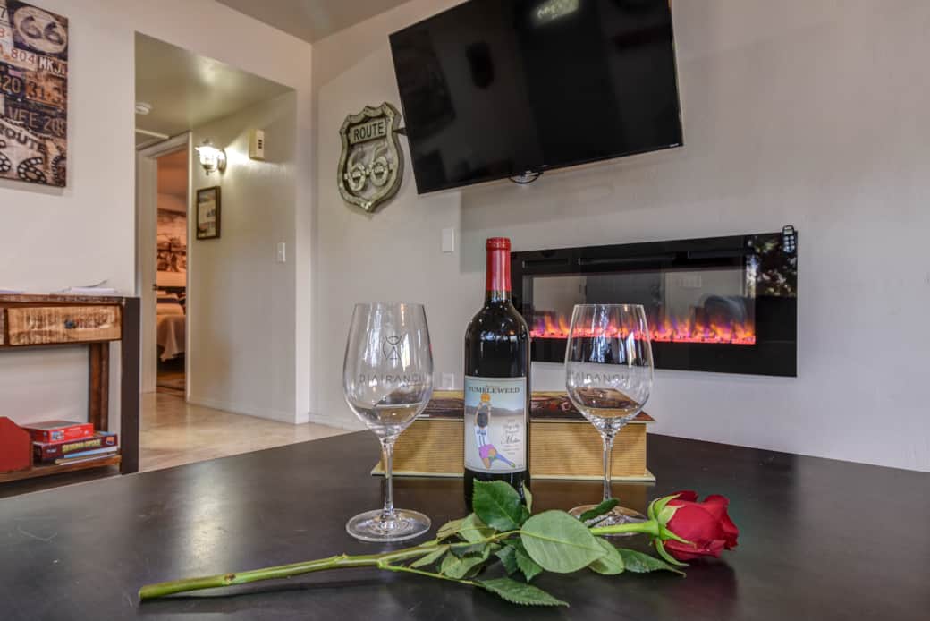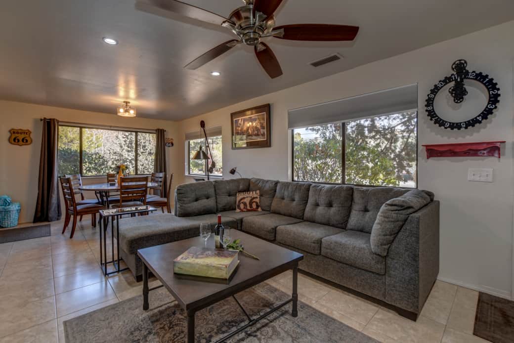 This uptown Route 66 home has two bright, airy bedrooms, each with comfortable mattresses and tasteful decor, creating a perfect place to relax after a long day of hiking or exploring the Uptown strip.