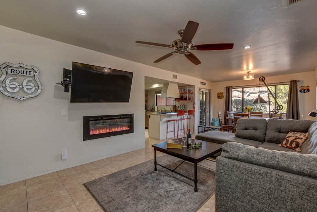 Prime Uptown Location! Walk to shops, eateries and tours. Retro Route 66 House boasts a hot tub, a large shared yard, and a full "well Stocked" kitchen, making it the perfect place for your whole group. 1100 Sq feet home with large windows for lots of natural light, retro decor creates a unique getaway in the iconic Red Rock Mountains. Best uptown location gives you easy access to local attractions.